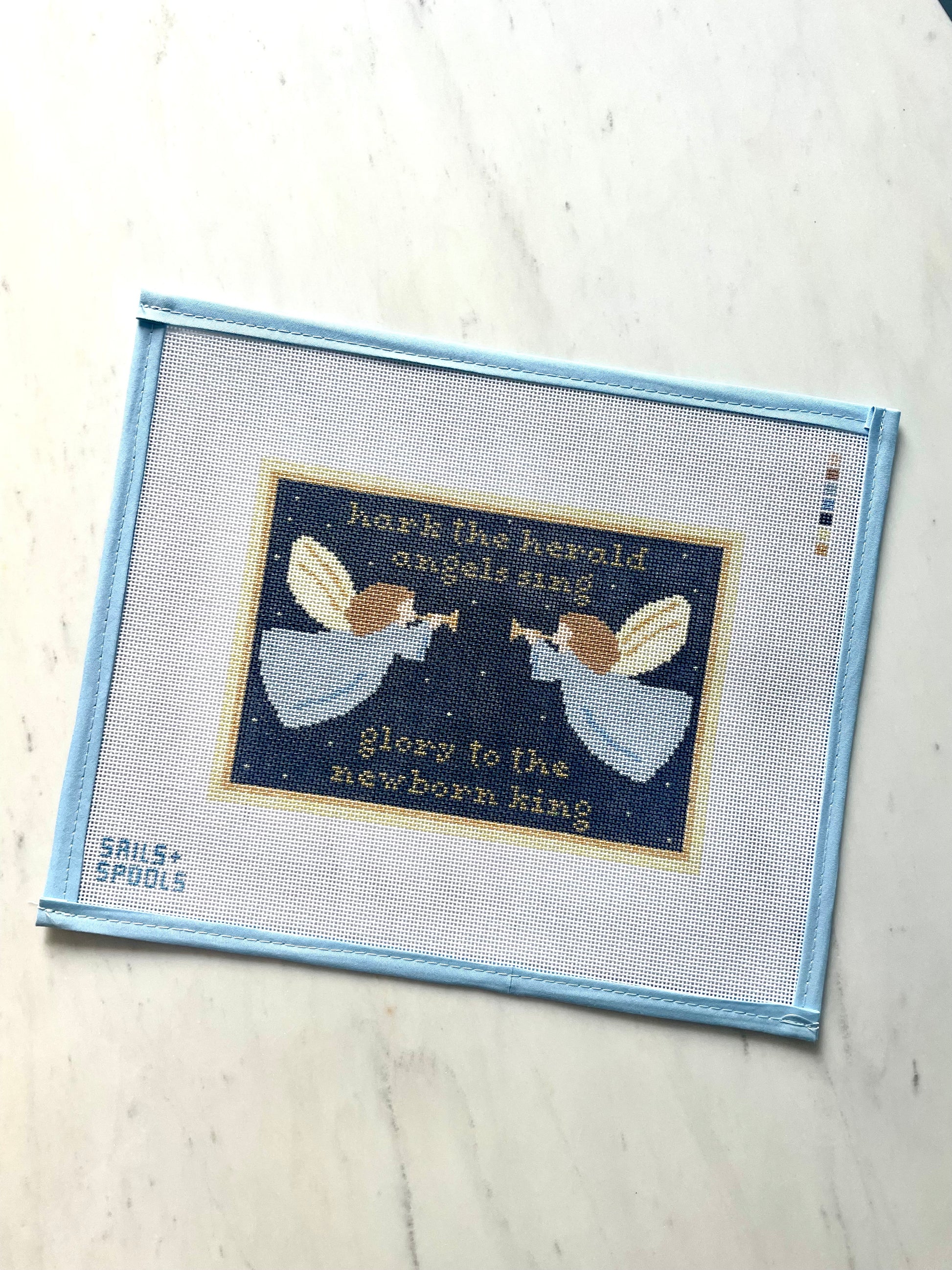 Celebrate the season with this sweet herald angels sign! It's the perfect canvas to create into a hanging sign, tray insert, or pillow for the Christmas season. Designed in-house & hand-painted, this 18-mesh canvas measures 5 inches by 7 inches.