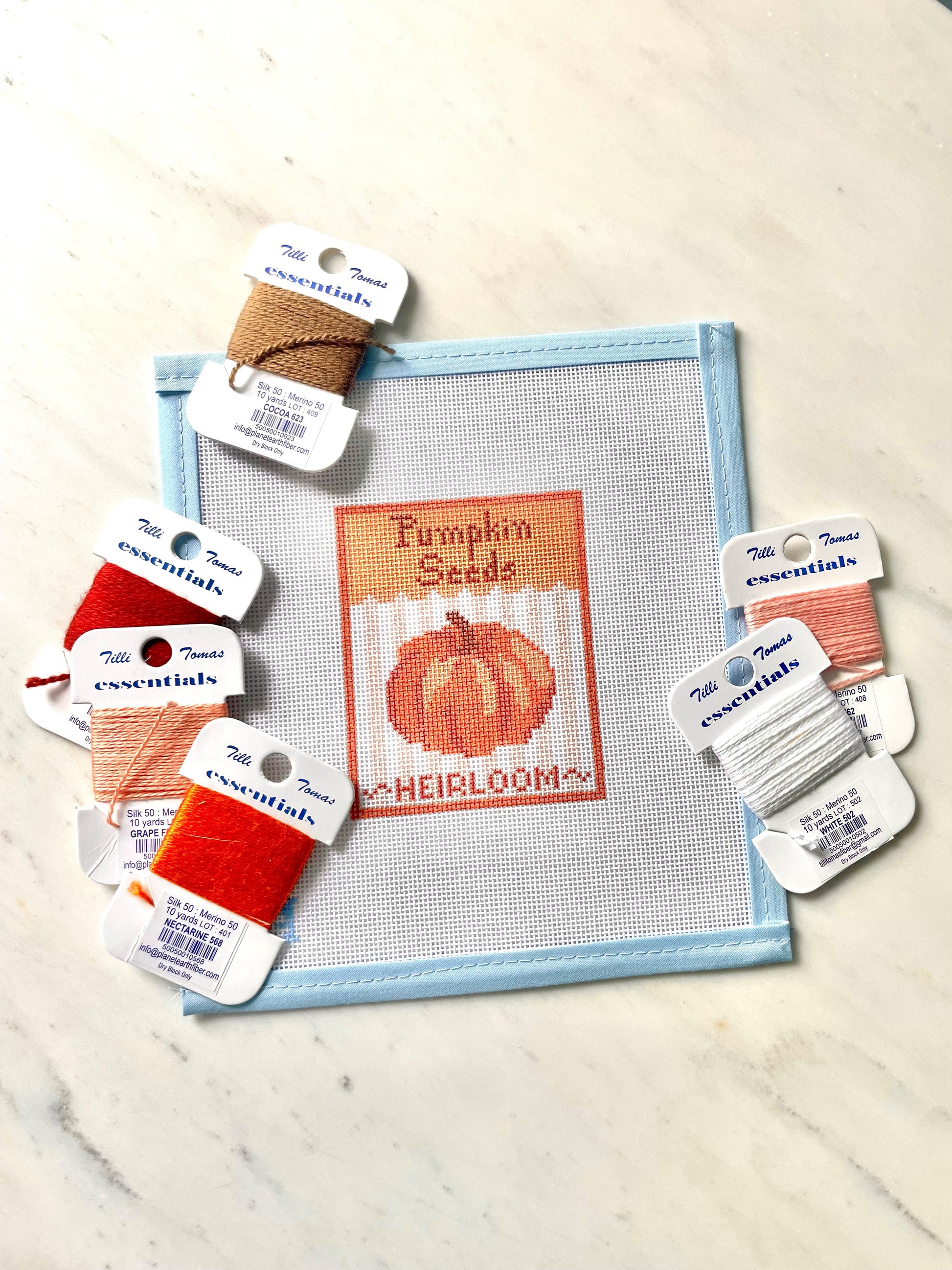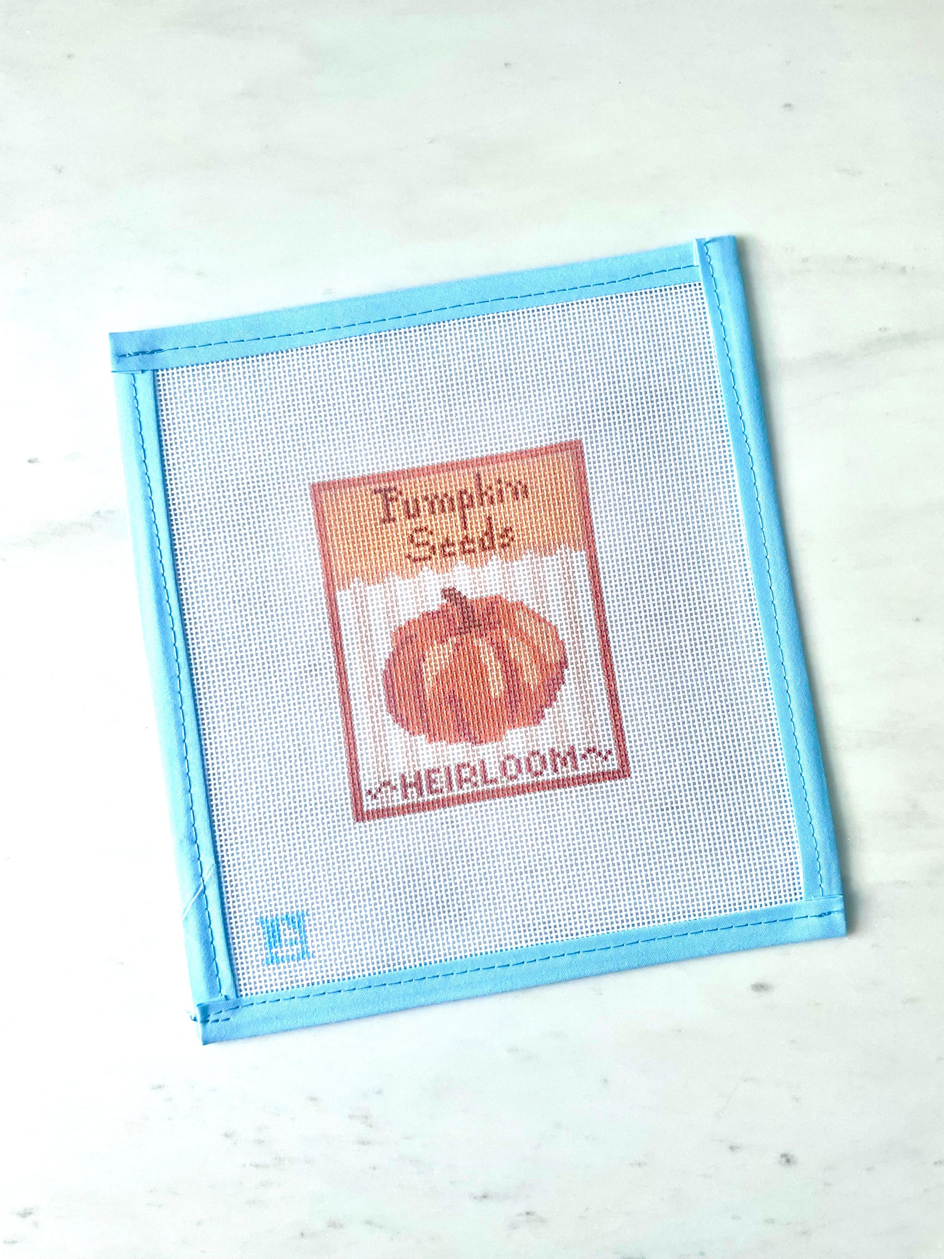 Bring the garden into your home all year long with our seed packet canvases! Each one is designed to capture the beauty of all that grows around us each season. Designed in house and hand painted, our 18-mesh needlepoint design measures 3 inches by 3.7 inches and is on an approximately 5 inch by 6 inch canvas.